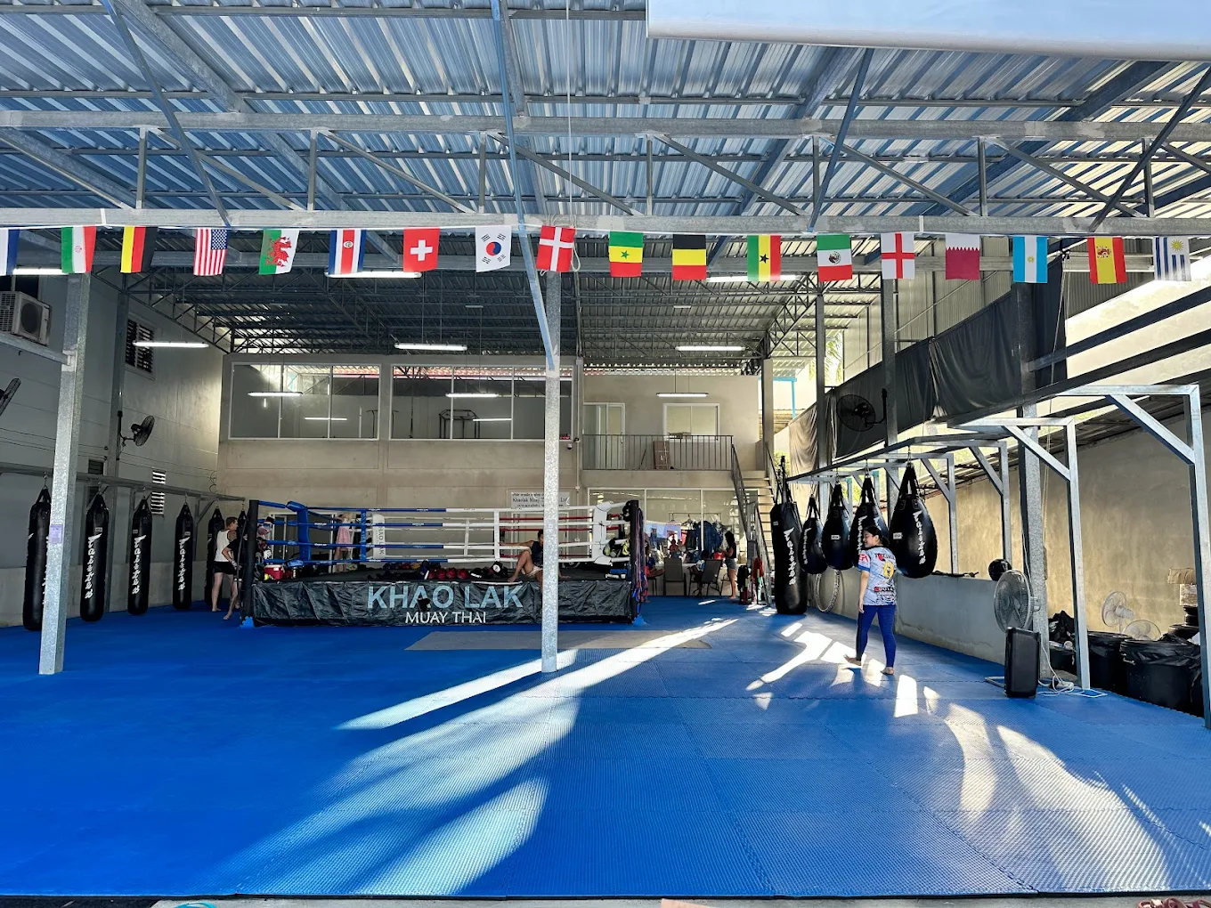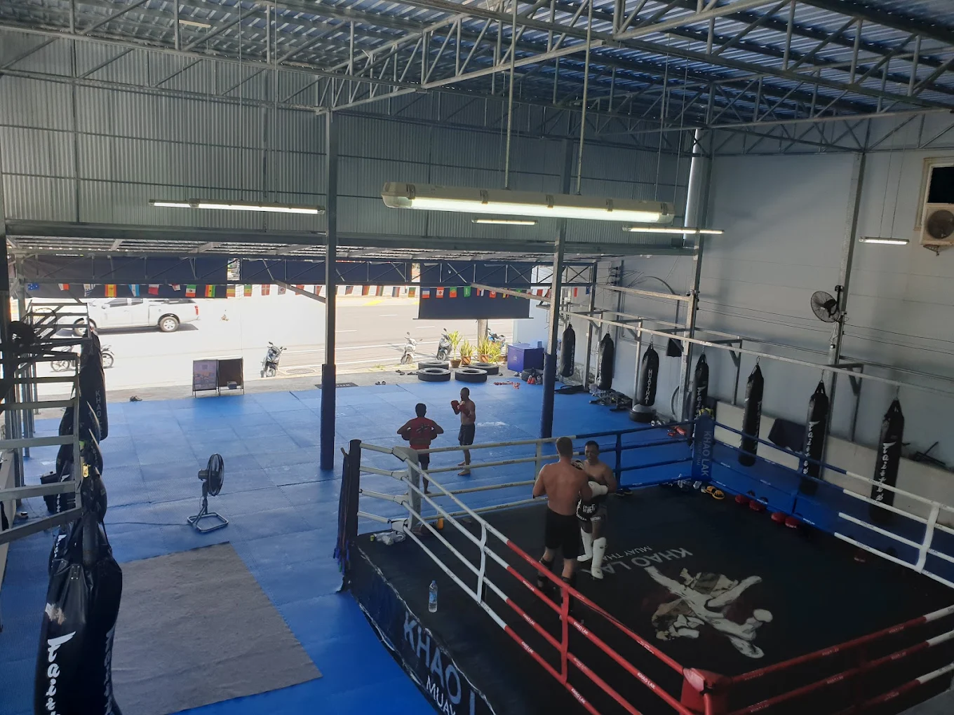 Ring de boxe et zone de sparring, avec matériel adapté à la pratique sérieuse de Muay Thai.