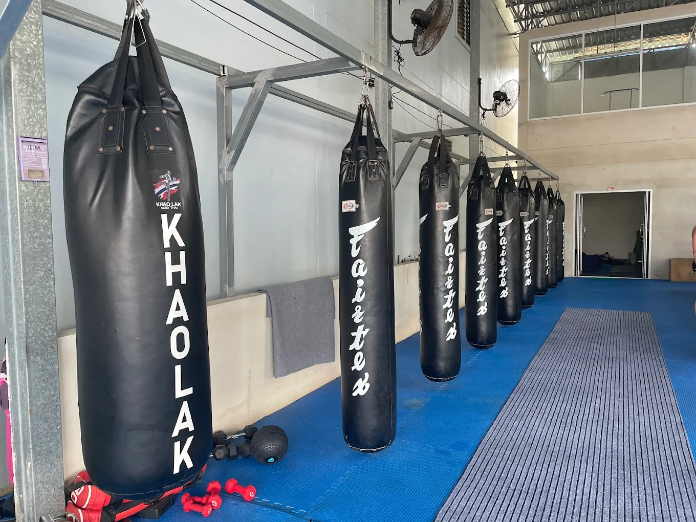 Plusieurs sacs de frappe, paos, matériel pour drill technique et puissance (bag‑work) intégré.