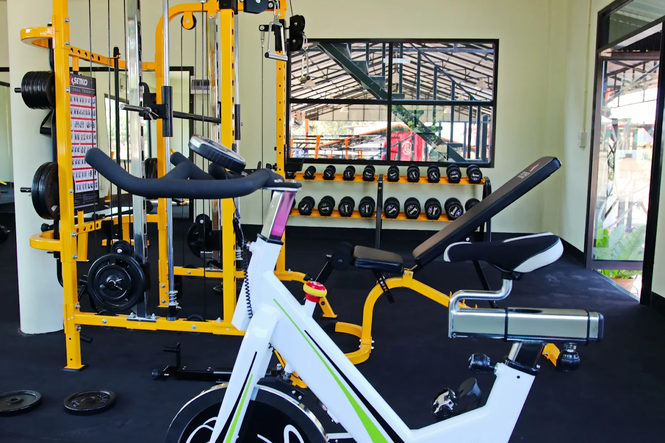 Espace de musculation et de conditionnement physique avec haltères, bancs, barres guidées